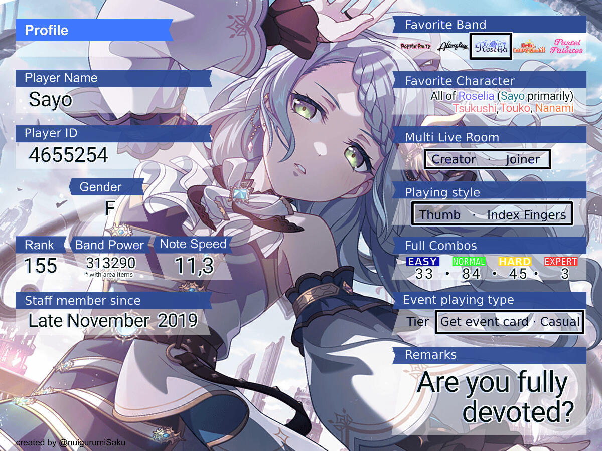 My carrd is a little outdated by now. Mainly in the games tab. But may also be in my intro and interests. I plan to try and update it, this includes the simple card. So please wait patiently to see updated information. Regardless. I hope my carrd proves to be sufficient in learning about me. Also, I hope the simple version has been helpful too. Ive realised more so over time just how inaccessible fonts can get, so hopefully the simple carrd does what it was made for. Be accessible. Anyhow. Sorry for the rant. Thanks for reading.[07/04/25]; Both Carrds reworked, the font was changed on this (main) carrd and information has been updated or rewritten, changes have been reflected on both sides.[19/07/25]: Finally went through my Carrd and updated it, especially that SUPER old bandori info card in the games tab. (thank you oomf and god bless the new sayo card)